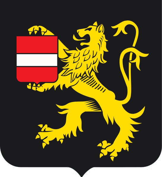 Auf schwarzem Grund ein aufgerichteter doppelschwänziger rotbezungter goldener Löwe, der den österreichischen Bindenschild (rot mit einem silbernen/weißen Querbalken) hält.